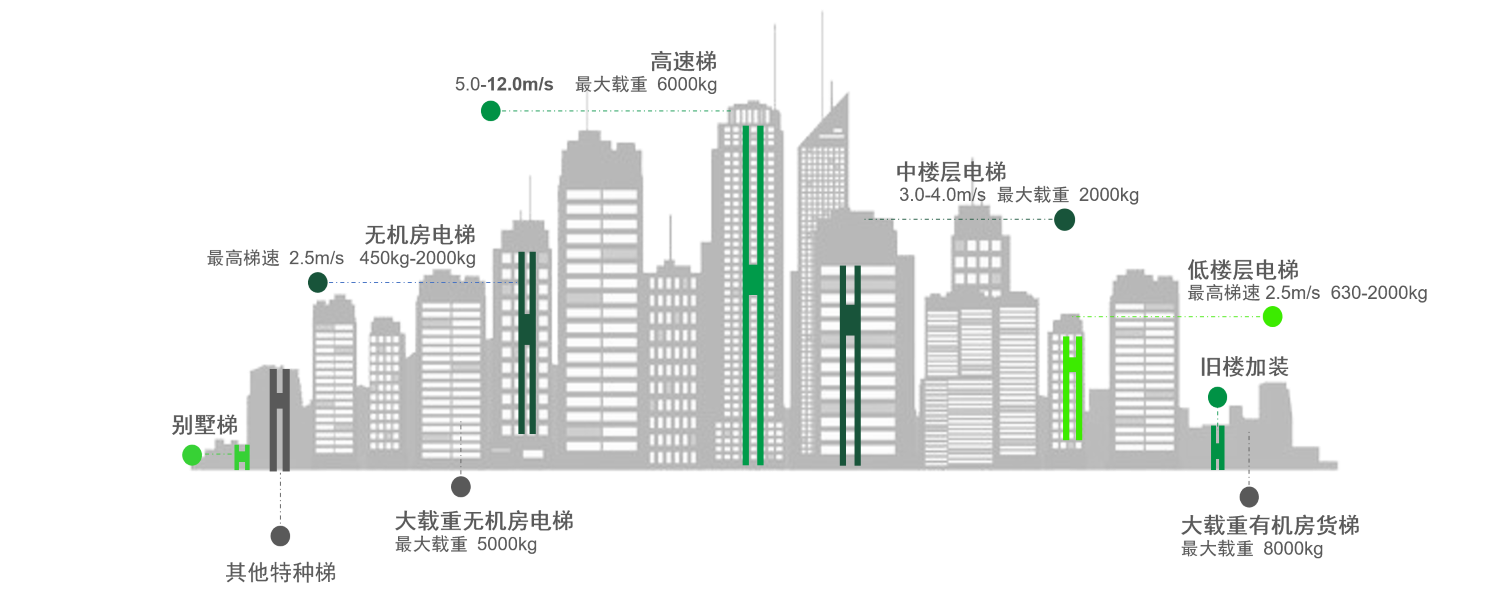 Chúng tôi cung cấp nhiều loại máy kéo và máy tính lớn phù hợp, phù hợp với các tình huống ứng dụng có tải trọng tối đa 6000kg (tỷ lệ 2:1) và tốc độ tối đa 12m/s (tỷ lệ 1:1). Khách hàng có thể trực tiếp lựa chọn model phù hợp dựa trên thông số thang máy, rút ngắn đáng kể chu trình thiết kế.