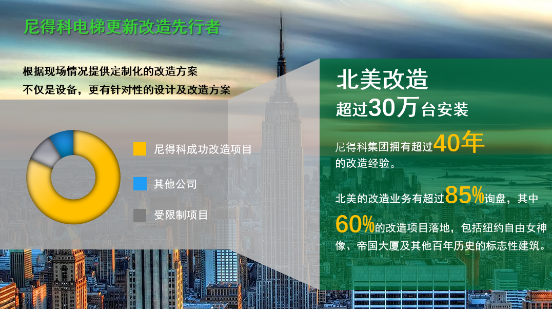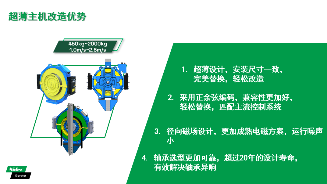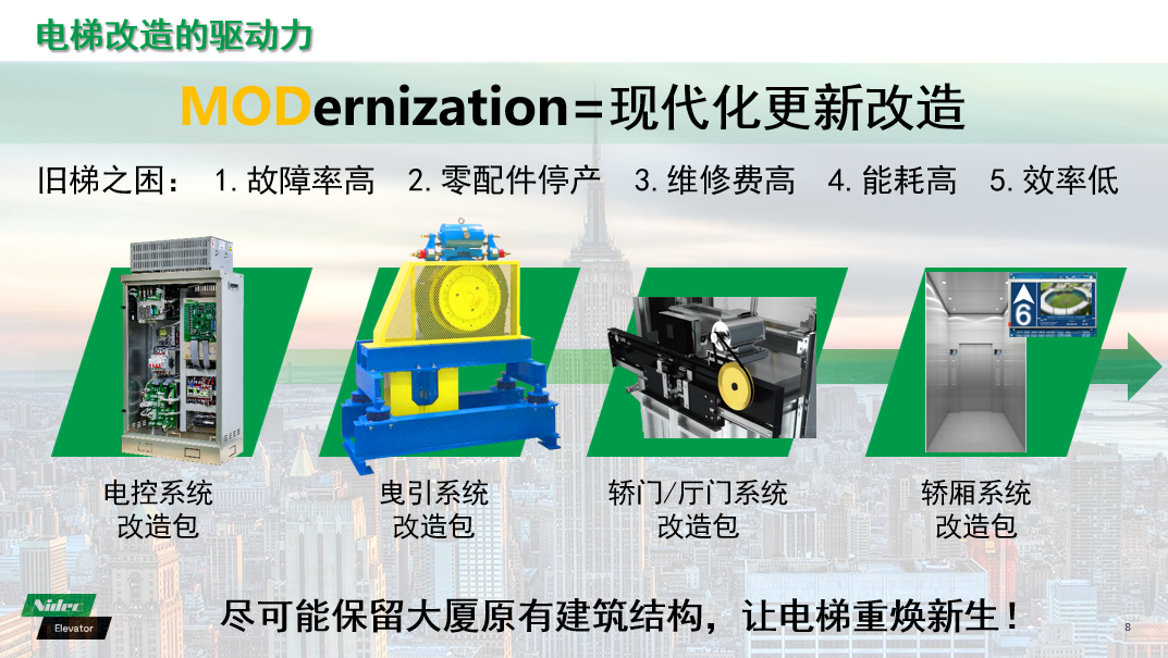 Với sự tăng tốc của đô thị hóa và sự tăng trưởng liên tục của quyền sở hữu thang máy, thị trường đổi mới và đổi mới thang máy đang mở ra các cơ hội phát triển lớn. Tận dụng nhiều năm tích lũy kỹ thuật trong các hệ thống truyền động thang máy, các thành phần thang máy NIDEC đã đưa ra một loạt các giải pháp cải tạo hệ thống ổ đĩa hiệu quả và đáng tin cậy để giải quyết các nhu cầu cốt lõi trong việc cải tạo thang máy cũ của các thương hiệu khác nhau, như bảo tồn năng lượng, tăng cường an toàn và nâng cấp thông minh.