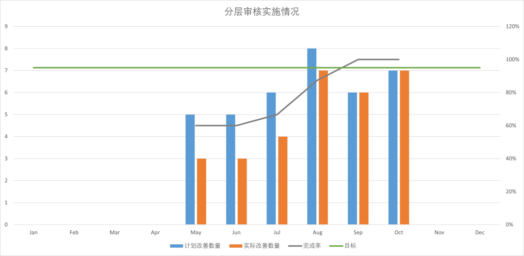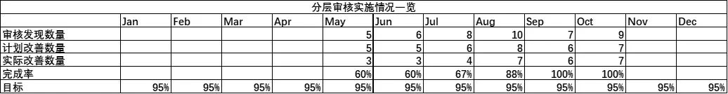 Nội dung của kiểm toán quy trình nhiều lớp là rộng rãi. Để giám sát hiệu quả và chất lượng của kiểm toán, việc triển khai LPA thực tế được hiển thị theo cách tương tự như bảng điều khiển. Nội dung được hiển thị bao gồm: Tỷ lệ hoàn thành thực hiện, số lượng kết quả kiểm toán, tỷ lệ hoàn thành cải tiến, v.v.