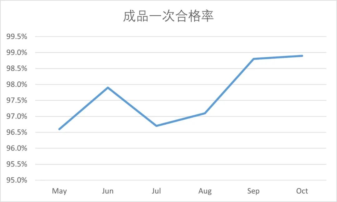 Thông qua việc thực hiện sáng kiến cải tiến tháng chất lượng này, nhận thức về chất lượng của tất cả nhân viên đã được tăng cường đáng kể và các chỉ số chất lượng đã được cải thiện rất nhiều. Cụ thể, các khiếm khuyết liên quan đến yếu tố "người đàn ông" trong 5M1E đã giảm đáng kể; Tỷ lệ cài đặt bị thiếu, cài đặt sai và cài đặt hỗn hợp đã giảm đáng kể; Các mối nguy hiểm chất lượng tiềm năng trong các quá trình liên quan đã giảm đáng kể; và chất lượng hoạt động của các quy trình đã được tối ưu hóa liên tục. Do đó, năng suất đầu tiên và tỷ lệ đủ điều kiện đầu tiên của sản phẩm đã tăng 1-2%, trong khi khiếu nại của khách hàng và lợi nhuận sản phẩm đã giảm đáng kể. Những cải tiến rõ ràng trong dữ liệu thể hiện đầy đủ tính hiệu quả và giá trị của sáng kiến cải tiến.