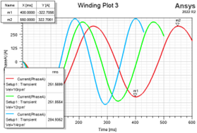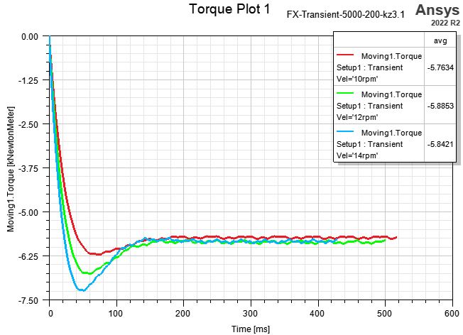 Mô-men xoắn ngôi sao tối đa đo được của máy kéo tương ứng với tốc độ 12 vòng / phút. Trong quá trình mô phỏng, tốc độ được tham số hóa là 10 vòng / phút, 12 vòng / phút và 14 vòng / phút để phù hợp với tốc độ đo được. Liên quan đến thời gian dừng mô phỏng, xem xét rằng các dòng cuộn dây ổn định nhanh hơn ở tốc độ thấp hơn, chỉ có 2 chu kỳ điện được đặt. Từ các đường cong kết quả của miền thời gian, có thể đánh giá rằng mô-men xoắn sao được tính toán và dòng điện cuộn dây đã ổn định. Mô phỏng cho thấy mô-men xoắn sao trạng thái ổn định ở mức 12 vòng / phút là lớn nhất, ở 5885,3nm, thấp hơn 5,6% so với giá trị đo được. Dòng điện cuộn đo được là 265,8 A và dòng mô phỏng là 251,8 A, với giá trị mô phỏng cũng thấp hơn 5,6% so với giá trị đo được, đáp ứng các yêu cầu về độ chính xác của thiết kế.