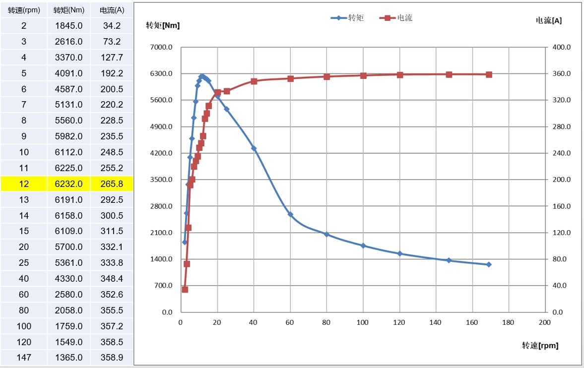 Để xác minh độ chính xác của kết quả mô phỏng, một máy kéo có dữ liệu thử nghiệm hiện tại đã được chọn, với tốc độ định mức là 159 vòng / phút. Mô-men xoắn sao trạng thái ổn định được đo và dòng điện cuộn ở các tốc độ khác nhau như sau. Mô-men xoắn ngôi sao đạt tối đa ở mức 12 vòng / phút.