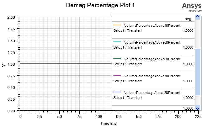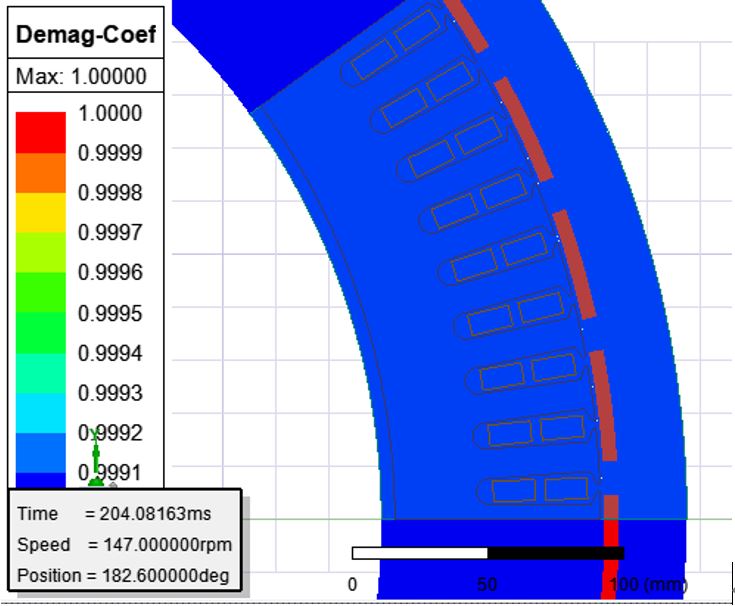 Máy kéo là thiết bị đặc biệt quan trọng về an toàn và khử từ nam châm vĩnh cửu là một trong những yếu tố chính ảnh hưởng đến hiệu suất và độ tin cậy của chúng. Không được phép khử từ các tiêu chuẩn vượt quá tiêu chuẩn. Trong bài báo này, phần mềm ANSYS Maxwell được sử dụng để mô phỏng các đặc tính khử từ của nam châm vĩnh cửu dưới các từ trường đảo ngược gây ra bởi các dòng điện ngắn mạch ở trạng thái niêm phong sao. Từ xu hướng hiện tại cuộn dây, đỉnh hiện tại vượt quá 1000 A tại thời điểm niêm phong sao và ổn định sau 6 chu kỳ điện. Tỷ lệ khử từ trong phần mềm Maxwell thể hiện tỷ lệ từ tính còn lại của nam châm vĩnh cửu sau khi tiếp xúc với trường khử từ với từ tính còn lại ban đầu của chúng; Giá trị của 1 chỉ ra không khử từ và 0 chỉ ra việc khử từ hoàn toàn. Từ các đường cong khử từ và bản đồ đường viền, tốc độ khử từ nam châm vĩnh cửu là 1, không quan sát thấy quá trình khử từ, xác nhận rằng máy kéo mô phỏng đáp ứng các yêu cầu về độ tin cậy.